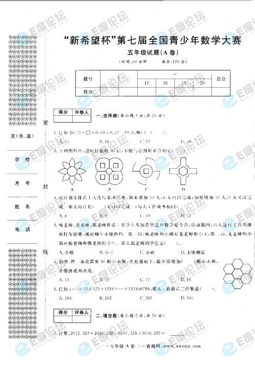 2011年第七届新希望杯数学竞赛五年级试卷及答案