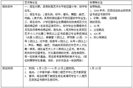 ○3艺术特长生:招生对象为对具有较高艺术特长的小学毕业生,招收专业为音乐(包括管乐、舞蹈、曲艺、戏曲)和美术小学应届毕业生需提供在校表现及文化课成绩证明(各类奖证复印件)。报名时间一般为三月底至四月中旬。