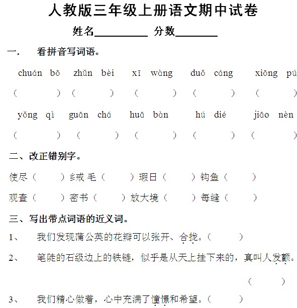 [人教版]三年级上册语文期中试卷1 武汉奥数网整理 2012-10-16 18:56:32 导读:又是一年期中考试到了,本期武汉奥数网上传三年级上册语文期中试卷,包括人教版、北师大版、苏教版。提供广大用户免费下载! 小学三年级上册数学语文期中试卷免费下载(第五册) 语文 数学 [苏教版]三年级上册语文期中试卷1 [苏教版]三年级上册数学期中试卷1(附答案) [苏教版]三年级上册语文期中试卷2 [苏教版]三年级上册数学期中试卷2(附答案) [北师大版]三年级上册语文期中试卷1 [北师大版]三年级上册数学期中试卷1 [北师大版]三年级上册语文期中试卷2 [北师大版]三年级上册数学期中试卷2 [人教版]三年级上册语文期中试卷1 [人教版]三年级上册数学期中试卷1 [人教版]三年级上册语文期中试卷2 [人教版]三年级上册数学期中试卷2 [人教版]三年级上册语文期中试卷1 部分试卷预览 小学一年级上册数学语文期中试卷免费下载(第一册) 语文 数学 [冀教版]一年级上册语文期中试卷 [北师大版]一年级上册数学期中试卷1 [苏教版]一年级上册语文期中试卷 [冀教版]一年级上册数学期中试卷 [北师大版]一年级上册语文期中试卷1 [苏教版]一年级上册数学期中试卷1 [北师大版]一年级上册语文期中试卷2 [苏教版]一年级上册数学期中试卷2 [人教版]一年级上册语文期中试卷1 [北师大版]一年级上册数学期中试卷2 [人教版]一年级上册语文期中试卷2 [人教版]一年级上册数学期中试卷1 [人教版]一年级上册数学期中试卷2 小学二年级上册数学语文期中试卷免费下载(第三册) 语文 数学 [苏教版]二年级上册语文期中试卷1 [苏教版]二年级上册数学期中试卷1 [苏教版]二年级上册语文期中试卷2 [苏教版]二年级上册数学期中试卷2 [北师大版]二年级上册语文期中试卷1 [北师大版]二年级上册数学期中试卷1 [北师大版]二年级上册语文期中试卷2 [北师大版]二年级上册数学期中试卷(附答案)2 [人教版]二年级上册语文期中试卷1 [人教版]二年级上册数学期中试卷1 [人教版]二年级上册语文期中试卷2 [人教版]二年级上册数学期中试卷2 小学三年级上册数学语文期中试卷免费下载(第五册) 语文 数学 [苏教版]三年级上册语文期中试卷1 [苏教版]三年级上册数学期中试卷1(附答案) [苏教版]三年级上册语文期中试卷2 [苏教版]三年级上册数学期中试卷2(附答案) [北师大版]三年级上册语文期中试卷1 [北师大版]三年级上册数学期中试卷1 [北师大版]三年级上册语文期中试卷2 [北师大版]三年级上册数学期中试卷2 [人教版]三年级上册语文期中试卷1 [人教版]三年级上册数学期中试卷1 [人教版]三年级上册语文期中试卷2 [人教版]三年级上册数学期中试卷2 小学四年级上册数学语文期中试卷免费下载(第七册) 语文 数学 [苏教版]四年级上册语文期中试卷1 [苏教版]四年级上册数学期中试卷1 [苏教版]四年级上册语文期中试卷2 [苏教版]四年级上册数学期中试卷2 [北师大版]四年级上册语文期中试卷1 [北师大版]四年级上册数学期中试卷1 [北师大版]四年级上册语文期中试卷2 [北师大版]四年级上册数学期中试卷2 [人教版]四年级上册语文期中试卷1 [人教版]四年级上册数学期中试卷1 [人教版]四年级上册语文期中试卷2 [人教版]四年级上册数学期中试卷2 小学五年级上册数学语文期中试卷免费下载(第九册) 语文 数学 [苏教版]五年级上册语文期中试卷1 [苏教版]五年级上册数学期中试卷1 [苏教版]五年级上册语文期中试卷2 [苏教版]五年级上册数学期中试卷2 [北师大版]五年级上册语文期中试卷1 [北师大版]五年级上册数学期中试卷1 [北师大版]五年级上册语文期中试卷2 [北师大版]五年级上册数学期中试卷2 [人教版]五年级上册语文期中试卷1 [人教版]五年级上册数学期中试卷1 [人教版]五年级上册语文期中试卷2 [人教版]五年级上册数学期中试卷2 小学六年级上册数学语文期中试卷免费下载(第十一册) 语文 数学 [苏教版]六年级上册语文期中试卷1 [苏教版]六年级上册数学期中试卷1 [苏教版]六年级上册语文期中试卷2 [苏教版]六年级上册数学期中试卷2 [北师大版]六年级上册语文期中试卷1 [北师大版]六年级上册数学期中试卷1 [北师大版]六年级上册语文期中试卷2 [北师大版]六年级上册数学期中试卷2 [人教版]六年级上册语文期中试卷1 [人教版]六年级上册数学期中试卷1 [人教版]六年级上册语文期中试卷2 [人教版]六年级上册数学期中试卷2 [人教版]六年级上册数学期中试卷3