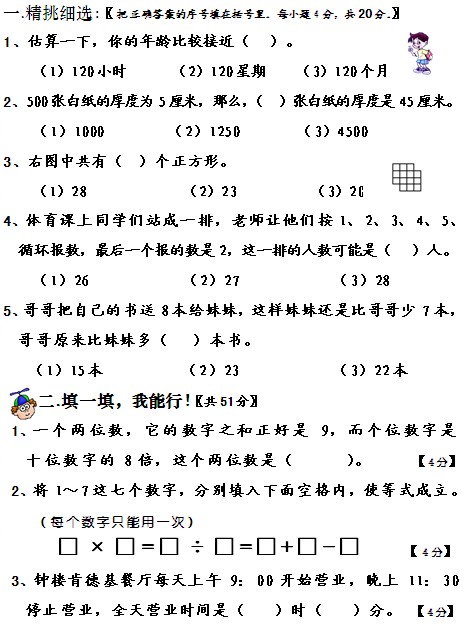 武汉奥数网11月9日:人教版小学三年级上学期数学期末总复习试卷,趣味数学竞赛题汇总!