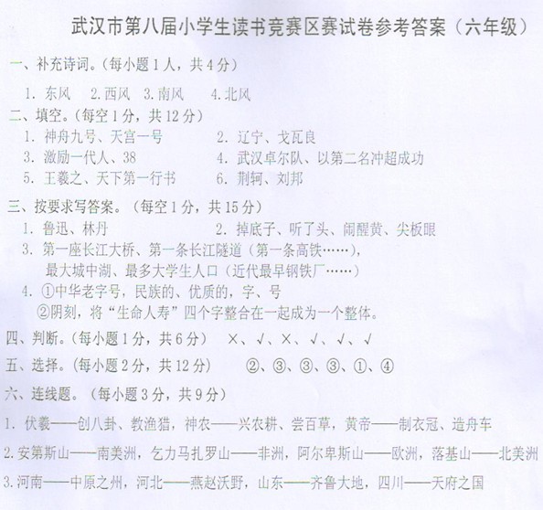 第八届读书知识竞赛区赛试卷及答案(六年级)(7)