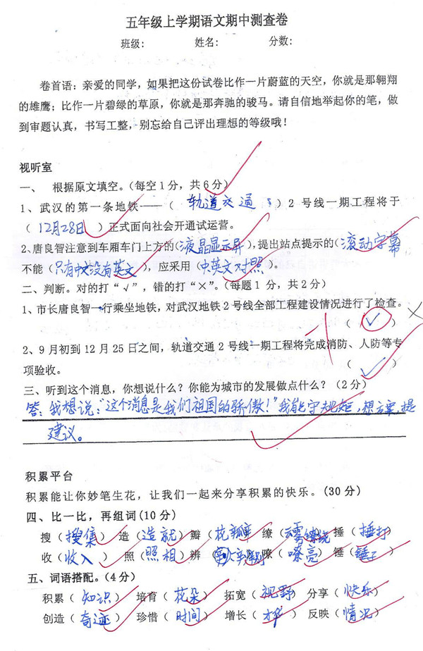 武汉奥数网11月28日:武汉各小学期中测试已经结束了,以下是育才二小五年级语文、数学、外语期中考试试卷及部分答案顶正!