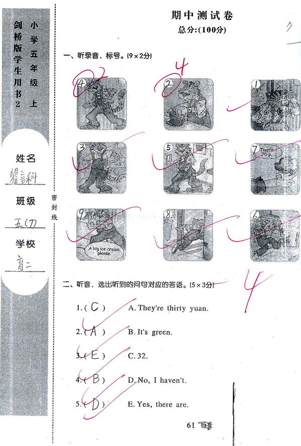 武汉奥数网11月28日:武汉各小学期中测试已经结束了,以下是育才二小五年级语文、数学、外语期中考试试卷及部分答案顶正!