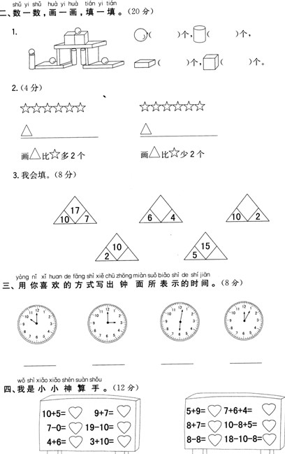 人教版一年级上册数学期末测试题及答案(7)(2)