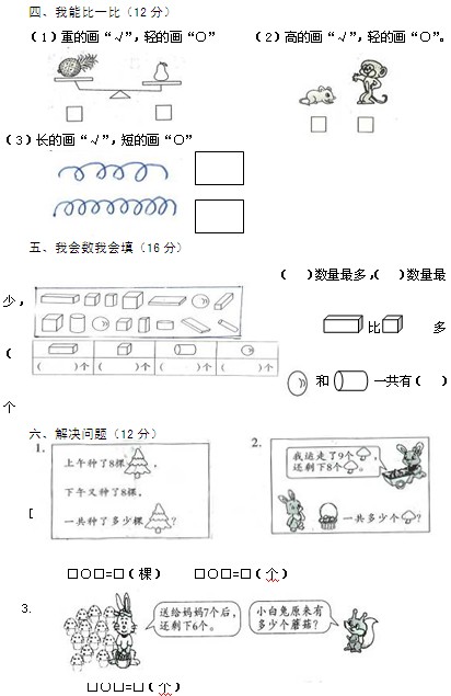 人教版一年级上册数学期末测试题及答案(9)(2)
