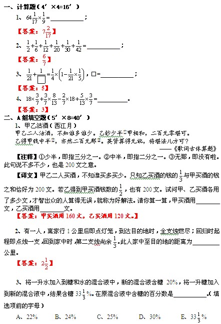 | 2012年秋明心数学资优生水平测试六年级试卷答案 | 2012年秋明心数学资优生水平测试五年级试卷答案 |