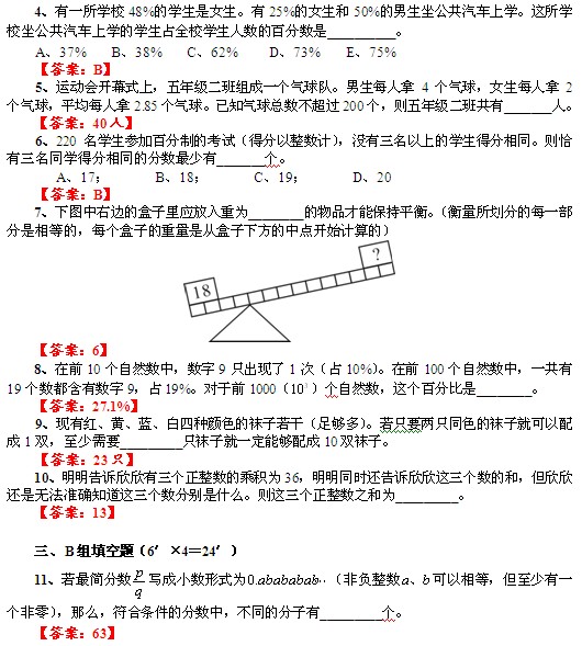2012年秋明心数学资优生水平测试六年级试卷答案(2)