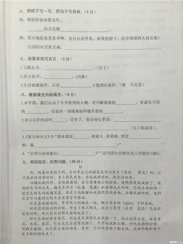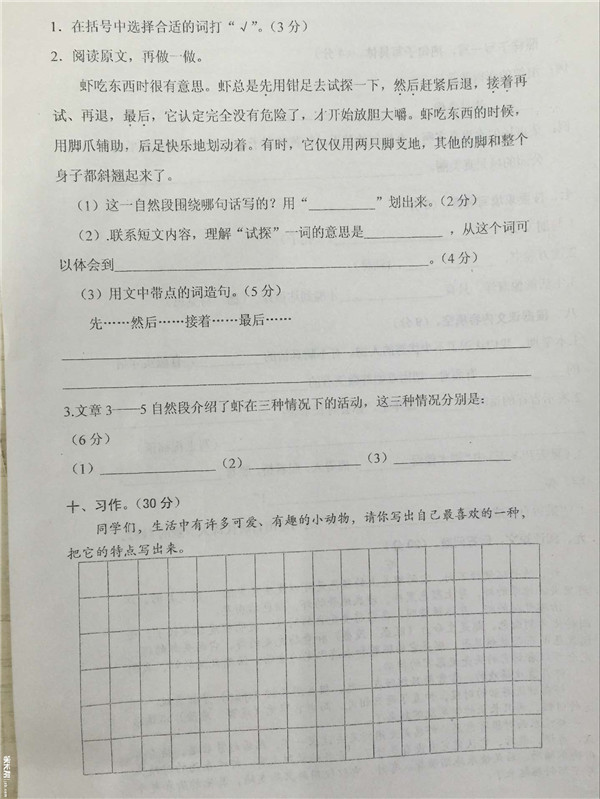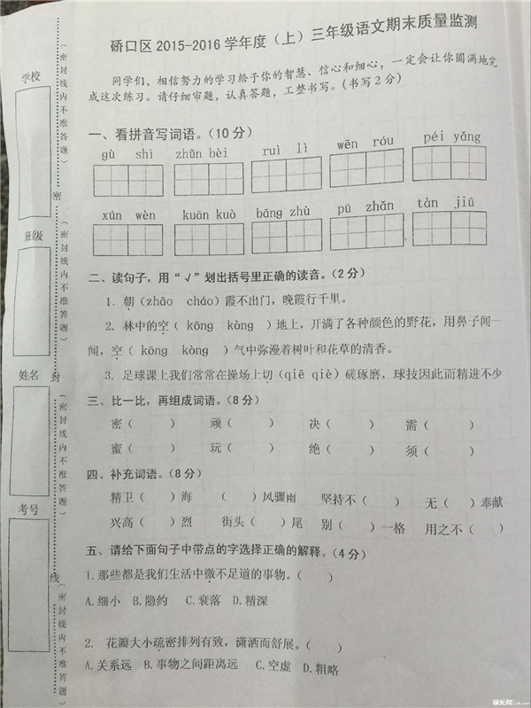 2016武汉硚口区三年级上语文期末试卷