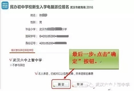 5、报名方式:由家长凭学生信息(姓名和国家学籍号)登录“武汉市民办初中学校新生入学报名平台”(http://zsrx.whjy.net)