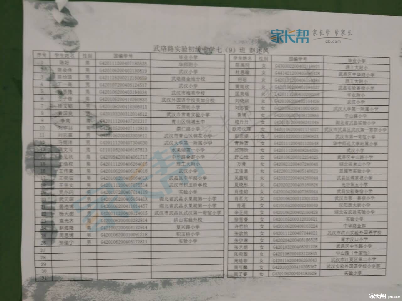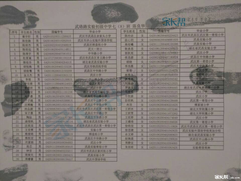 2016年武汉武珞路中学新初一分班名单公示(8)