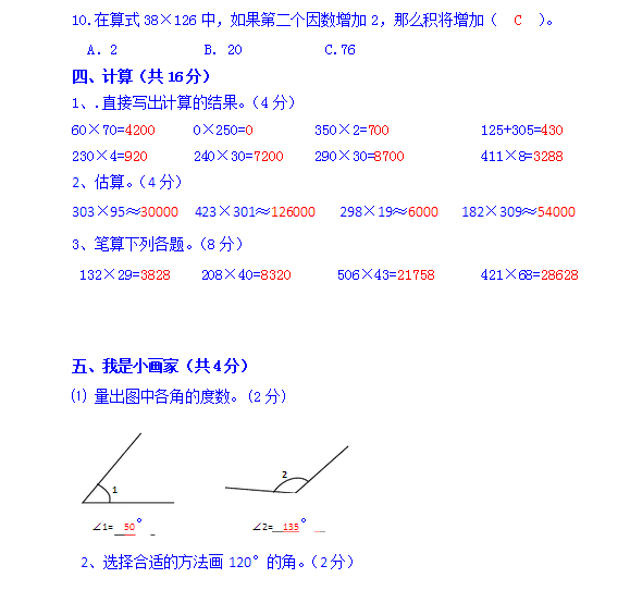人教版小学四年级上册数学期中试卷及答案(卷三)(13)