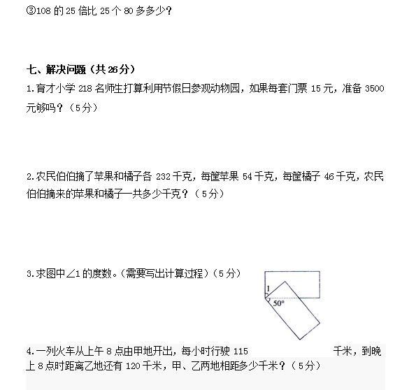 人教版小学四年级上册数学期中试卷及答案(卷三)(7)