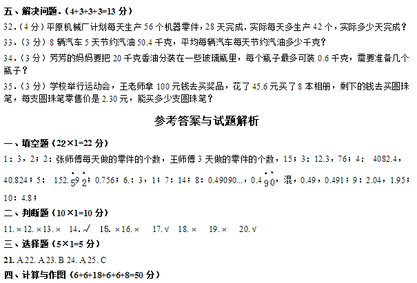 五年级上册数学期中试卷及答案卷一(2014年)(5)