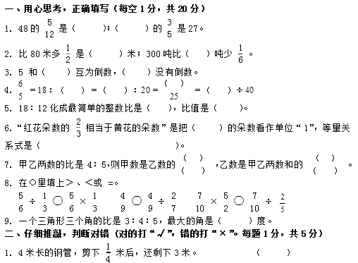 六年级数学上册期中试卷及答案之卷一(人教版)