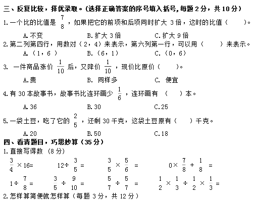 六年级数学上册期中试卷及答案之卷一(人教版)(2)