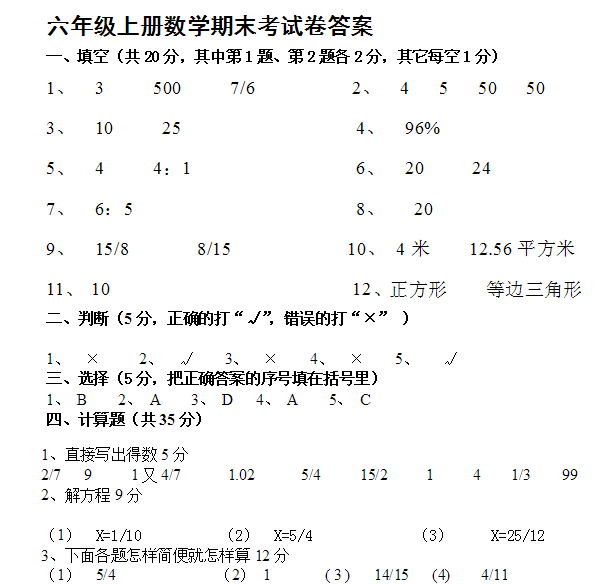 六年级数学上册期中试卷及答案之卷二(人教版)(9)