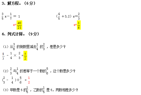 六年级数学上册期中试卷及答案之卷六(人教版)(11)