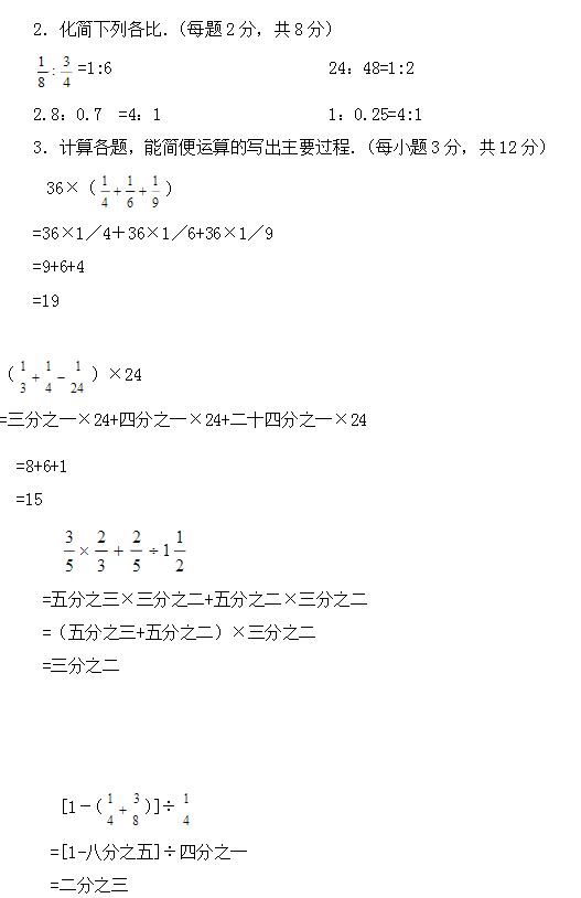 六年级数学上册期中试卷及答案之卷九(人教版)(3)