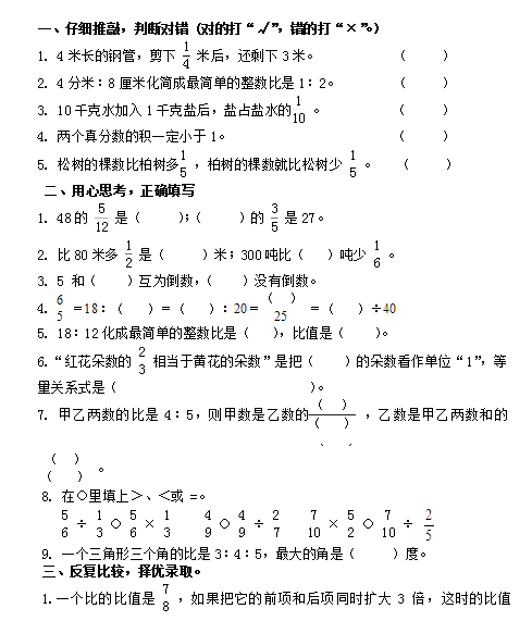六年级数学上册期中试卷及答案之卷十(人教版)