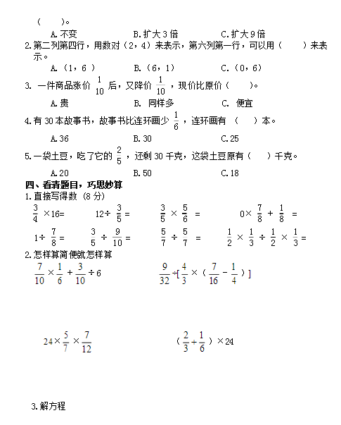 六年级数学上册期中试卷及答案之卷十(人教版)(2)
