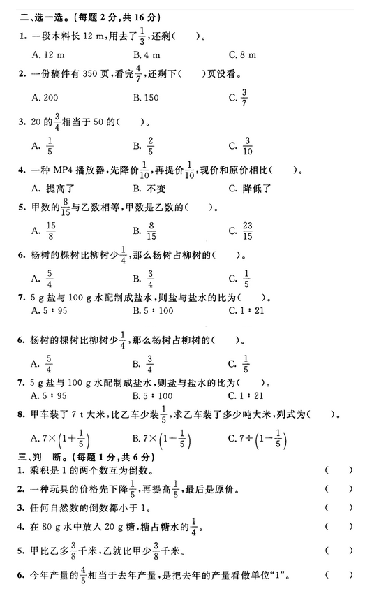 六年级数学上册期中试卷十一(人教版)(2)