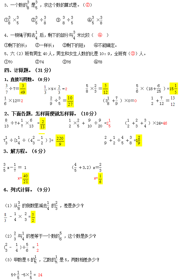 六年级数学上册期中试卷(2014年新人教版)(5)