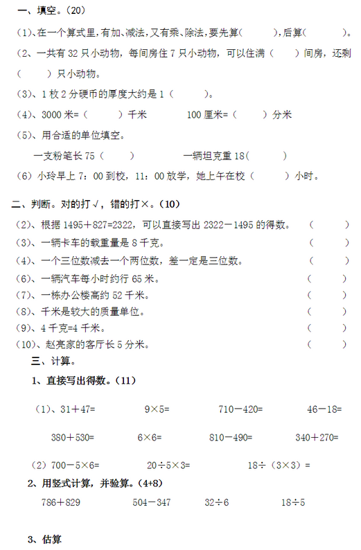 小学三年级数学上册期中试卷六(人教版)