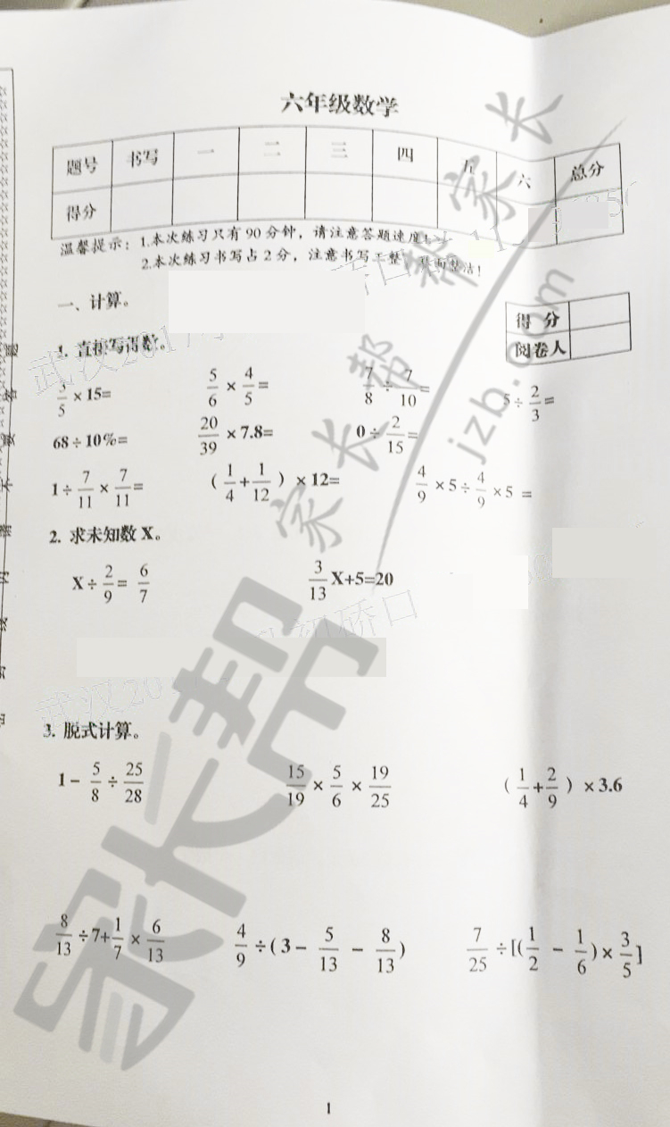 2017年武汉硚口区小升初元调数学试卷