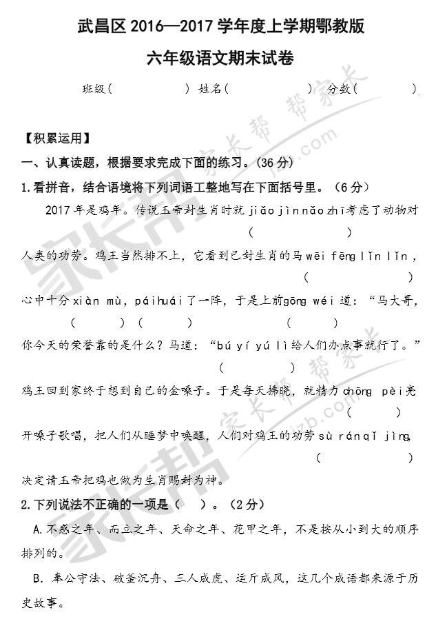 2017年武汉武昌区小升初元调语文试卷(鄂教版)