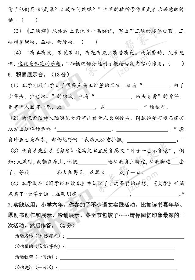2017年武汉武昌区小升初元调语文试卷(鄂教版)(3)