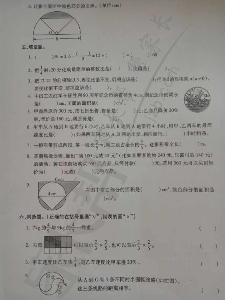 2017年武汉江汉区小升初元调数学试卷(鄂教版)(3)