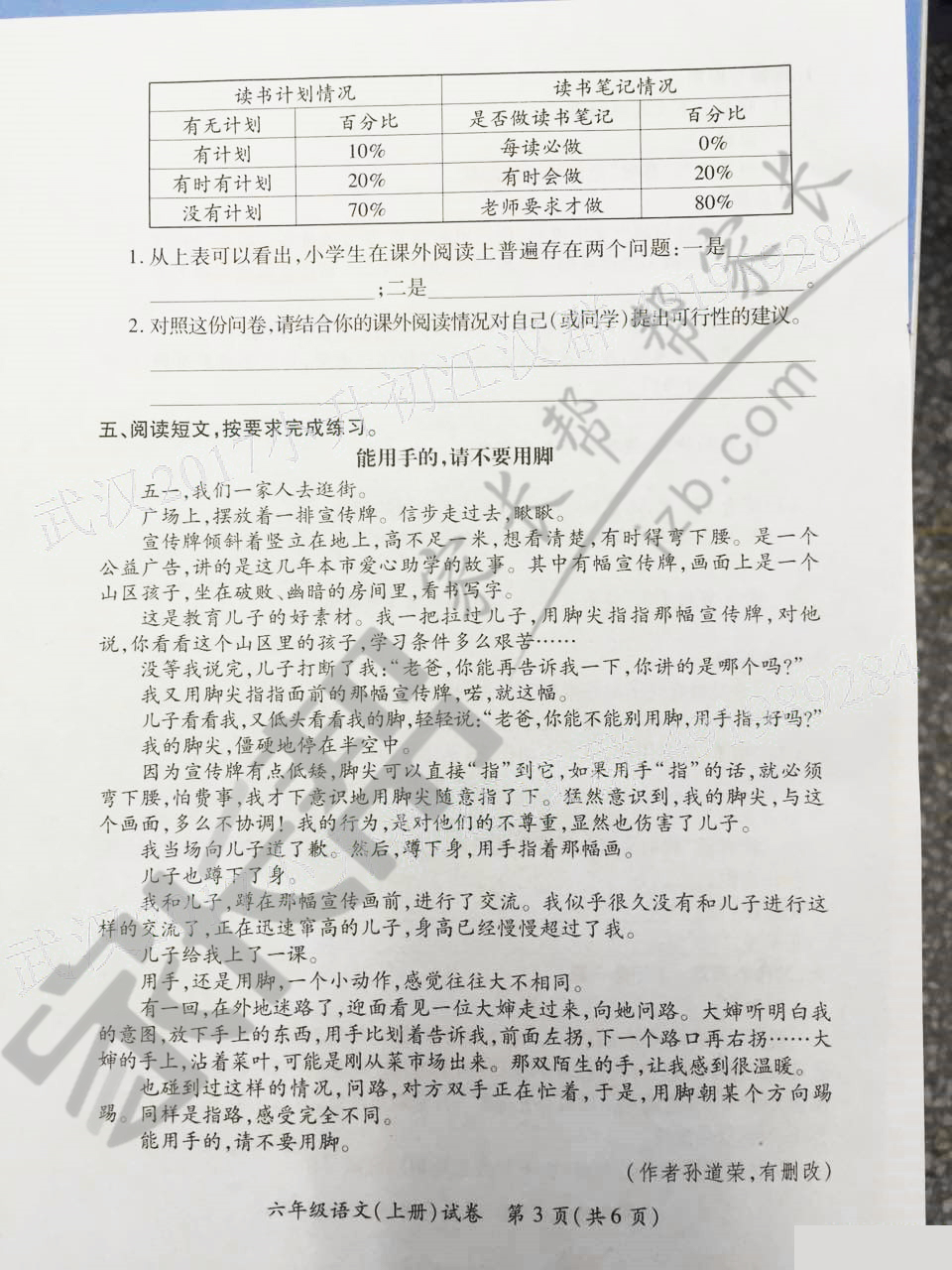 2017年武汉江汉区小升初元调语文试卷(鄂教版)(3)