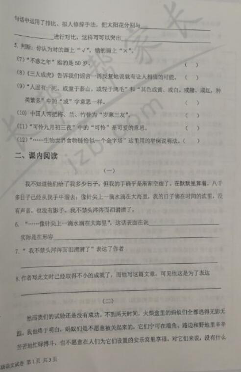 2017年武汉青山区小升初元调语文试卷及答案(2)
