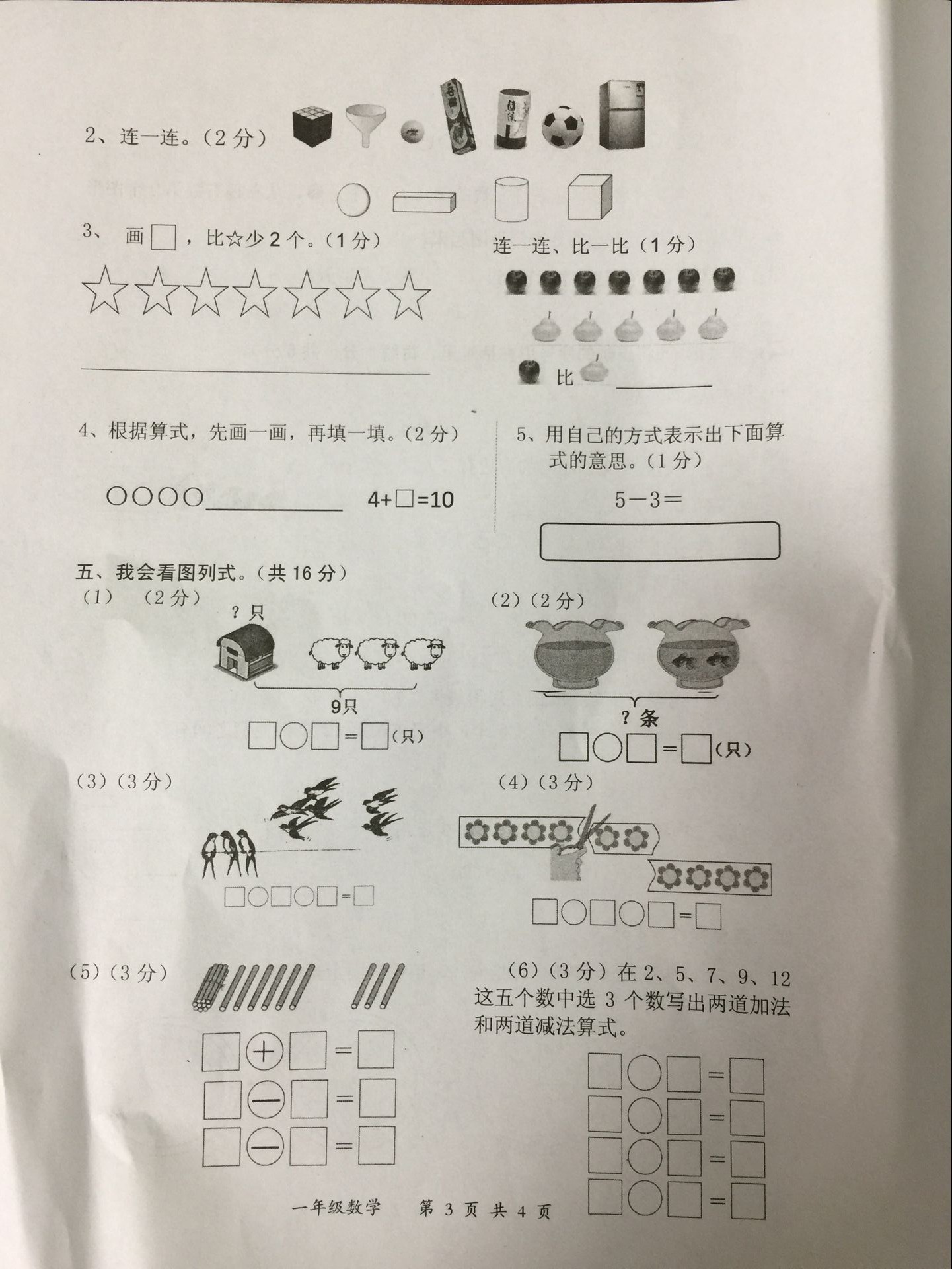 2016-2017学年上学期武汉东新区一年级数学期末试卷(3)