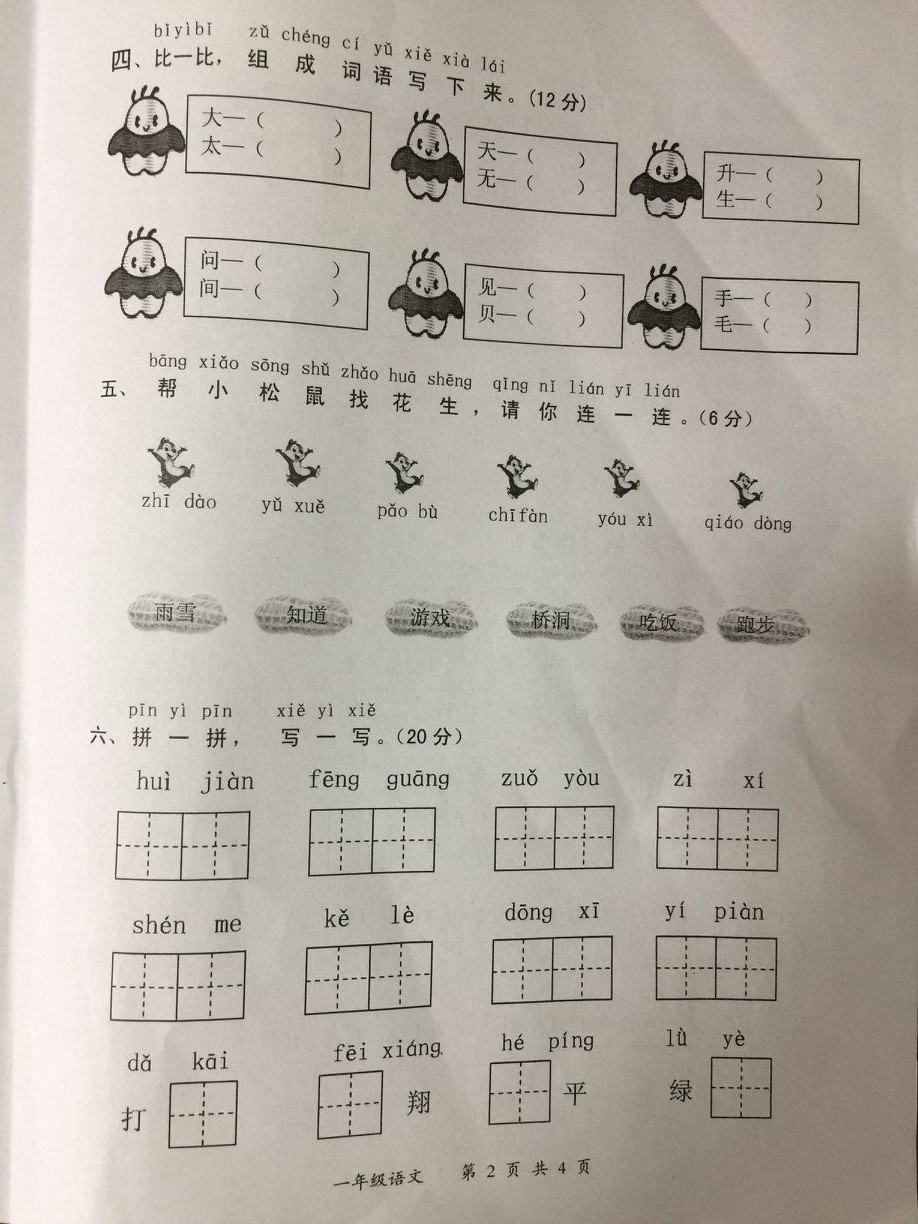 2016-2017学年上学期武汉东新区一年级语文期末试卷(2)
