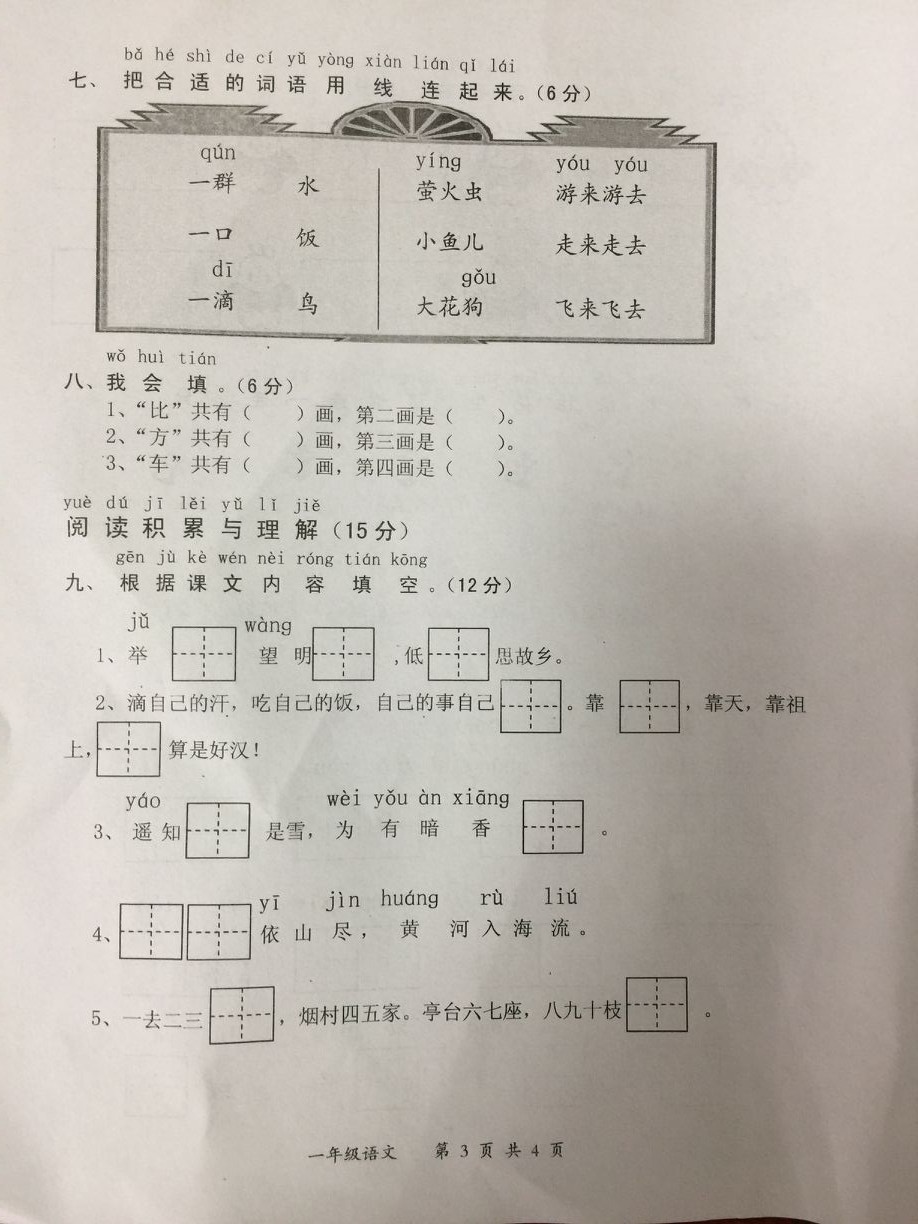 2016-2017学年上学期武汉东新区一年级语文期末试卷(3)