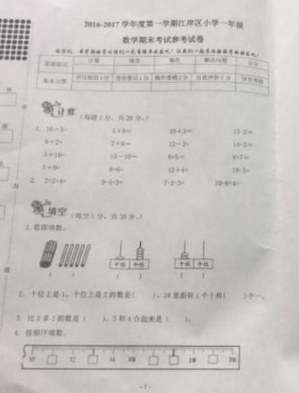 2016-2017学年上学期武汉江岸区一年级数学期末试卷