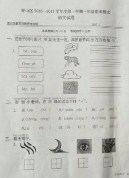 2016-2017学年上学期武汉青山区一年级语文期末试卷