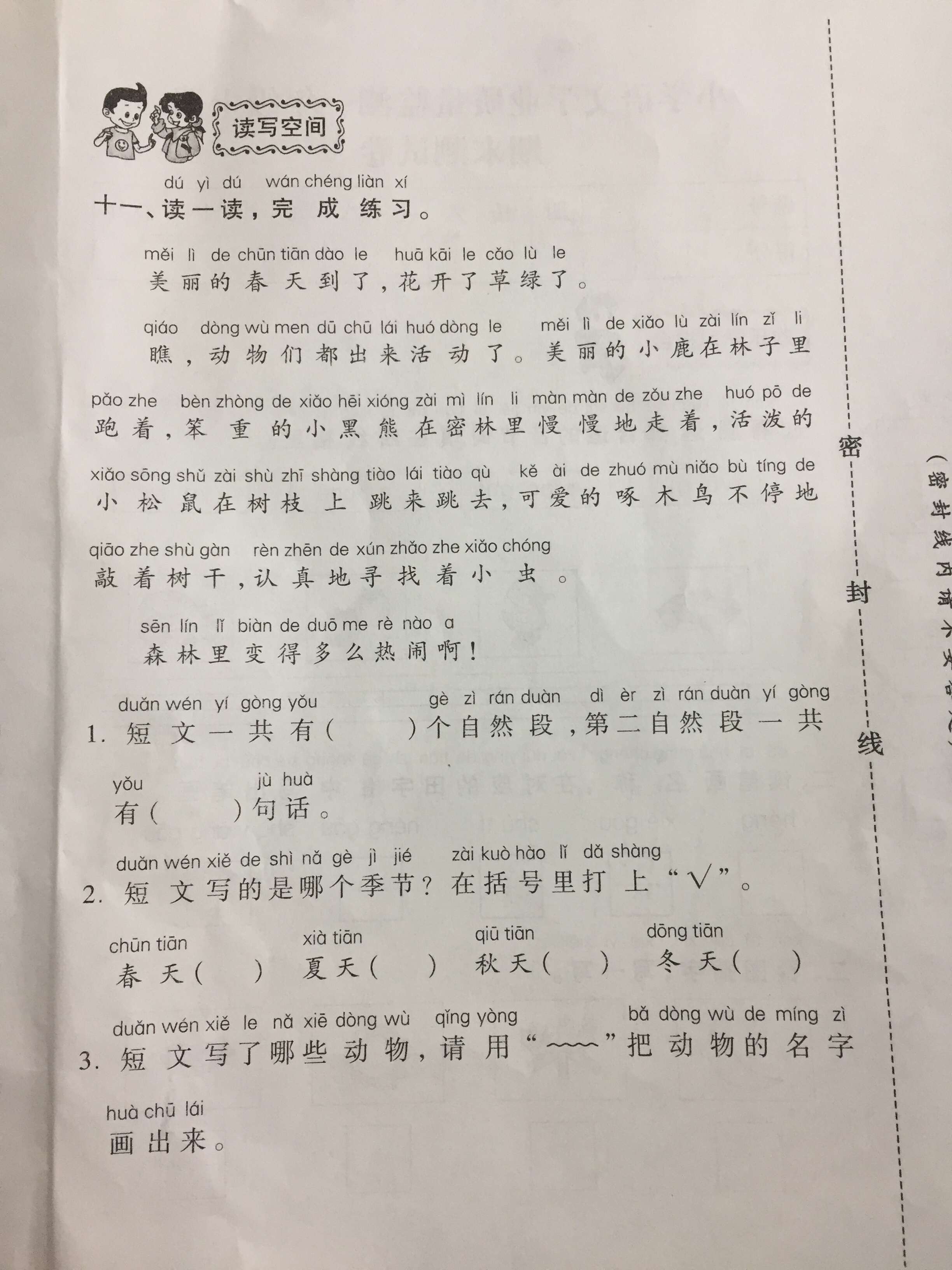 2016-2017学年上学期武汉江汉区一年级语文期末试卷(4)