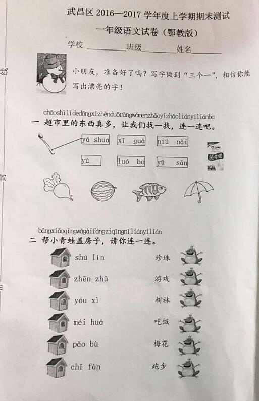 2016-2017学年上学期武汉武昌区一年级语文期末试卷