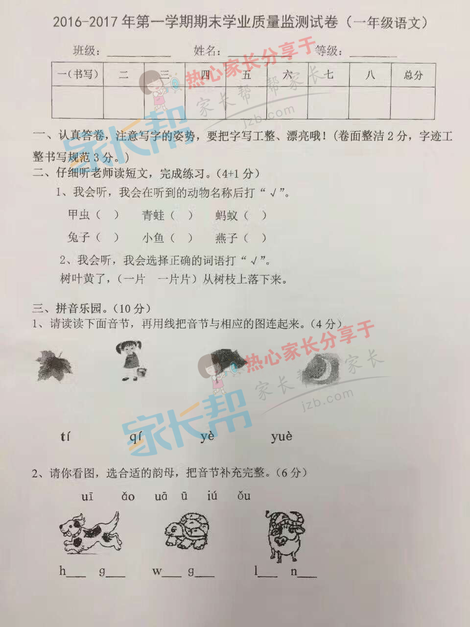 2016-2017学年上学期武汉硚口区一年级语文期末试卷