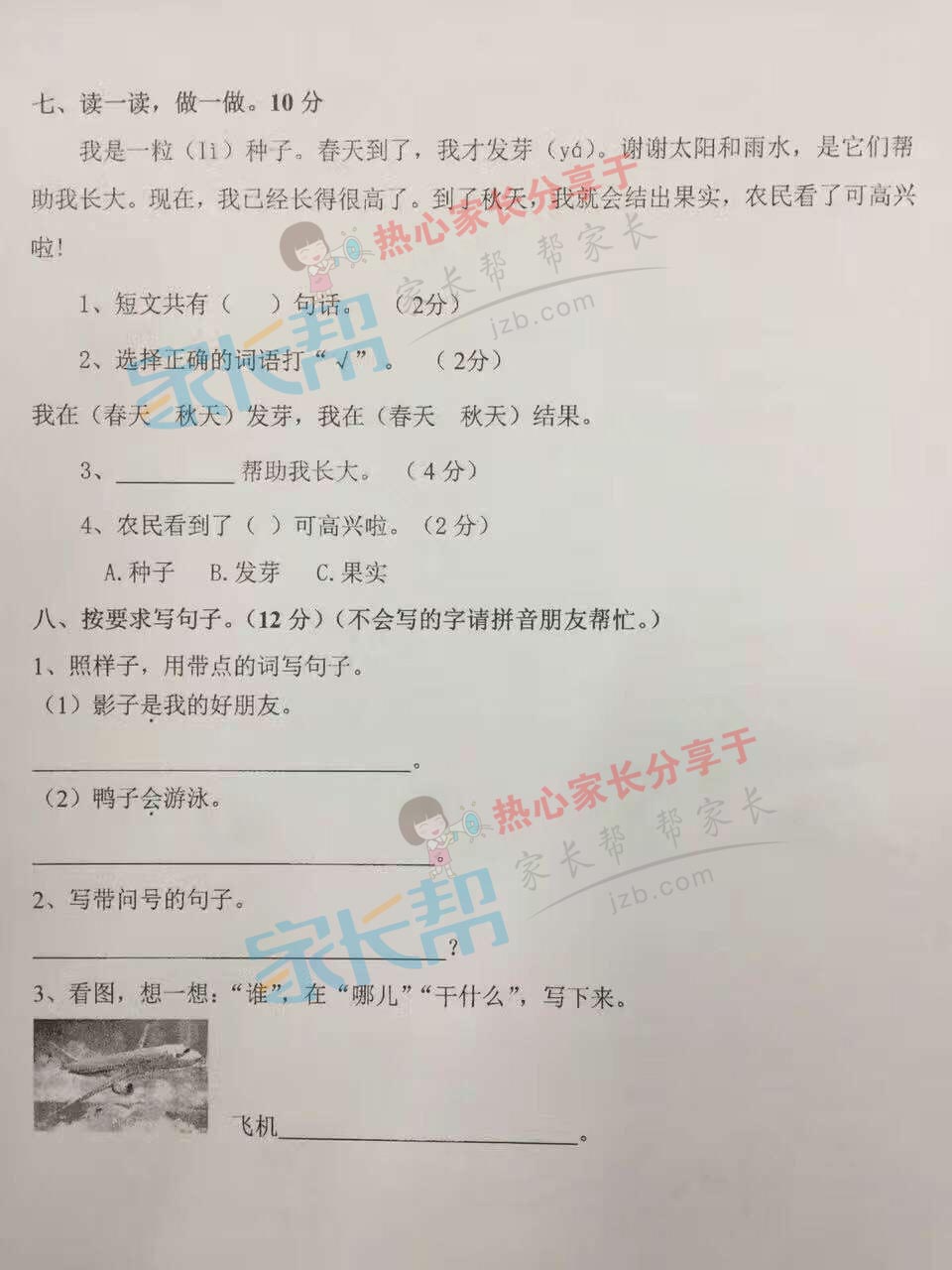 2016-2017学年上学期武汉硚口区一年级语文期末试卷(4)