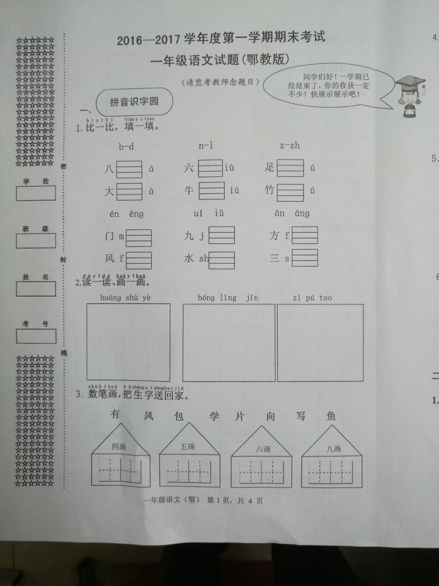 2016-2017学年上学期武汉洪山区一年级语文期末试卷
