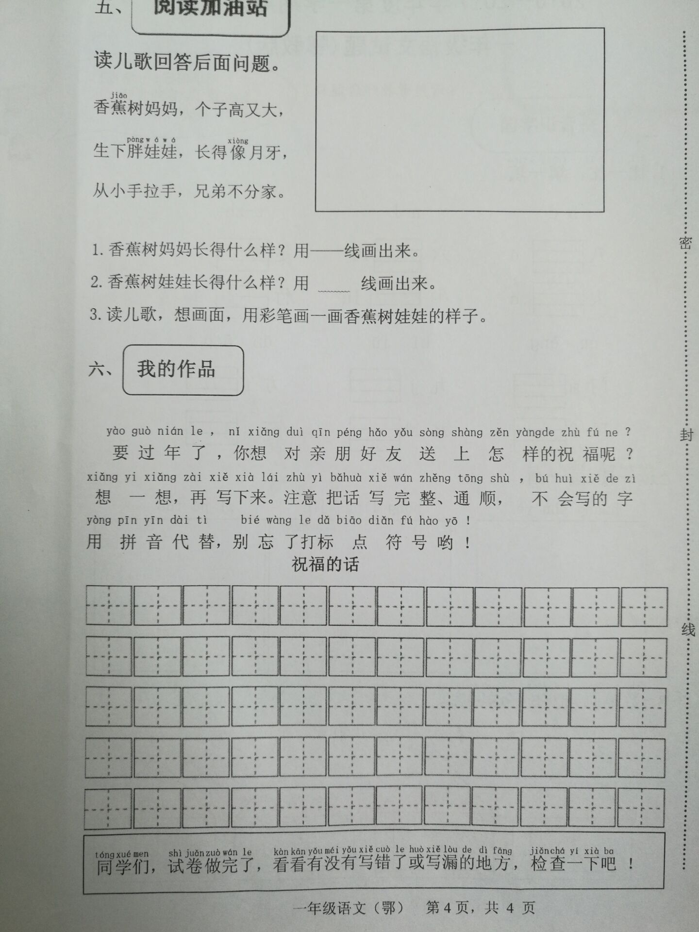 2016-2017学年上学期武汉洪山区一年级语文期末试卷(4)
