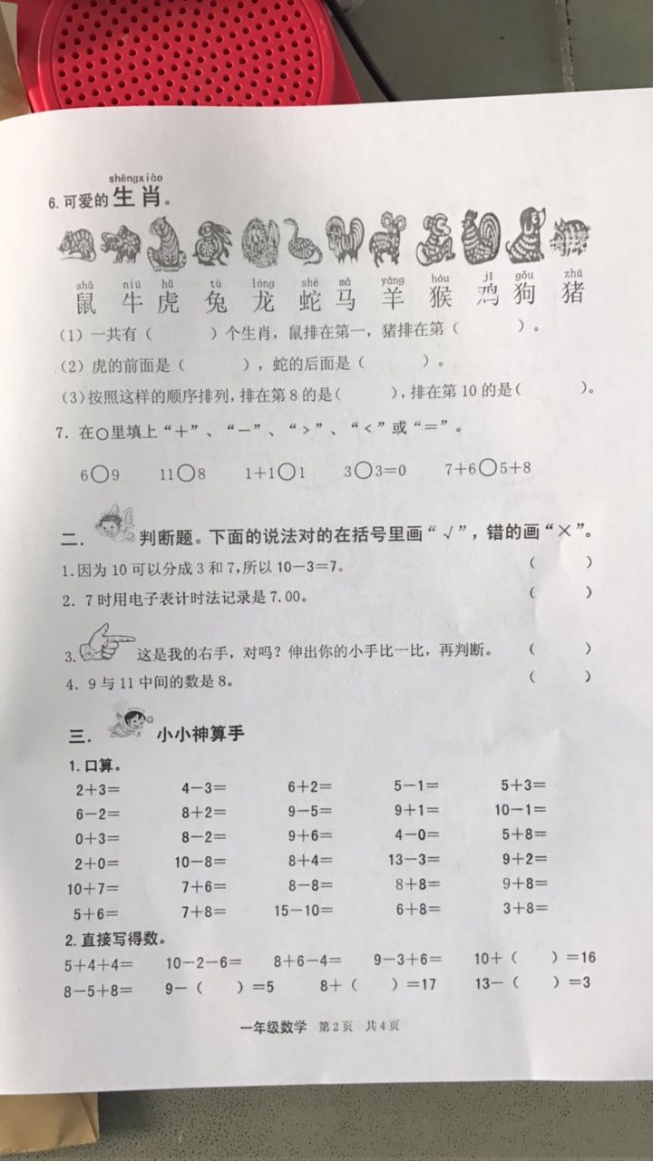 2016-2017学年上学期武汉洪山区一年级数学期末试卷(2)