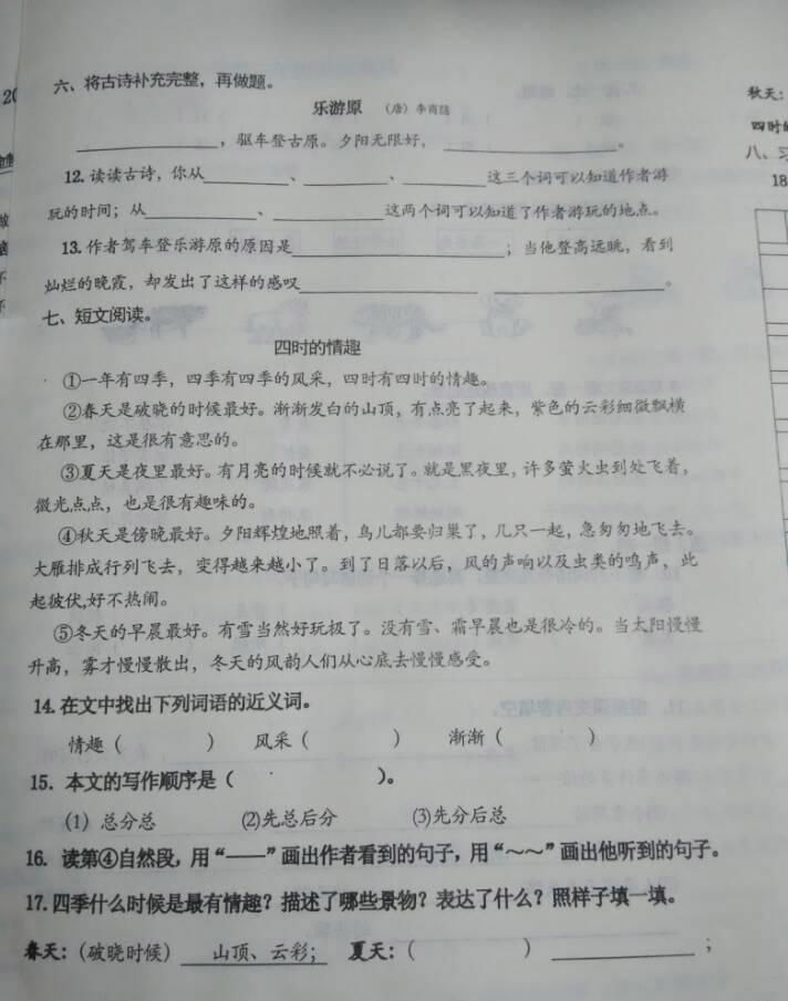 2016-2017学年上学期武汉青山区三年级语文期末试卷(3)