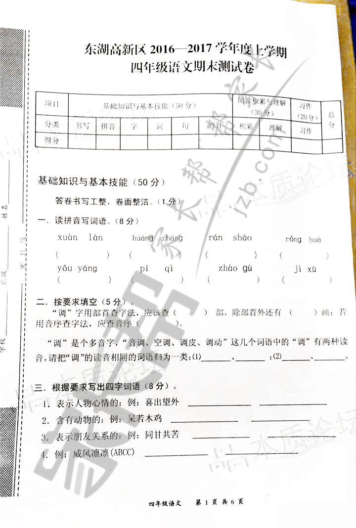 2016-2017学年上学期武汉东新区四年级语文期末试卷