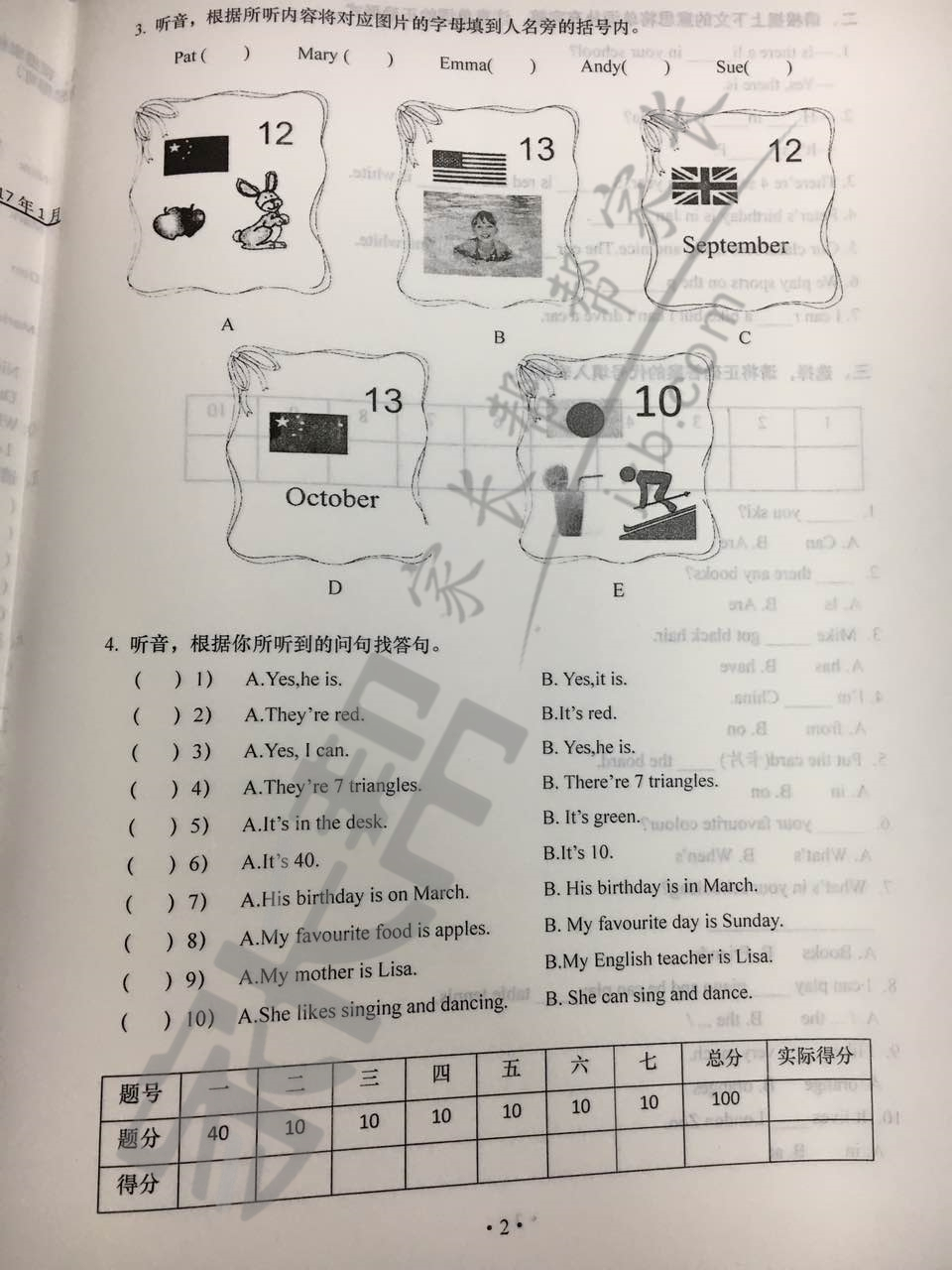 2016-2017学年上学期武汉汉阳区四年级英语期末试卷(2)