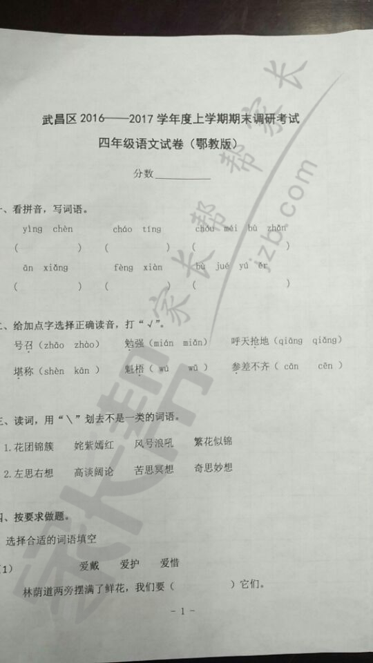2016-2017学年上学期武汉武昌区四年级语文期末试卷