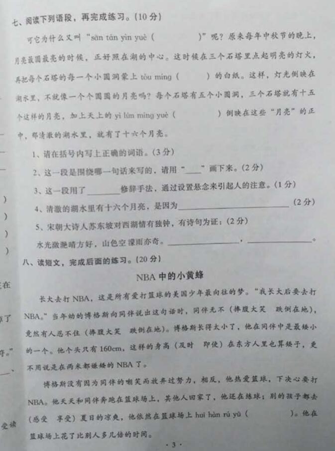 2016-2017学年上学期武汉江岸区四年级语文期末试卷(3)
